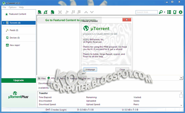 FREE Download µTorrent 3.2.3 FINAL - uTorrent merupakan software torrent client yang paling banyak digunakan dan paling populer. Software ini sangat ringan, cepat dan memiliki antar muka yang sangat user friendly, uTorrent juga memiliki semua yang diperlukan oleh sebuah software download manager. Selain itu, software ini bersifat freeware (gratis) sehingga anda tidak perlu lagi khawatir mencari serial, crack dan segala macam aktivator untuk mengaktivasi software accelerator uTorrent.